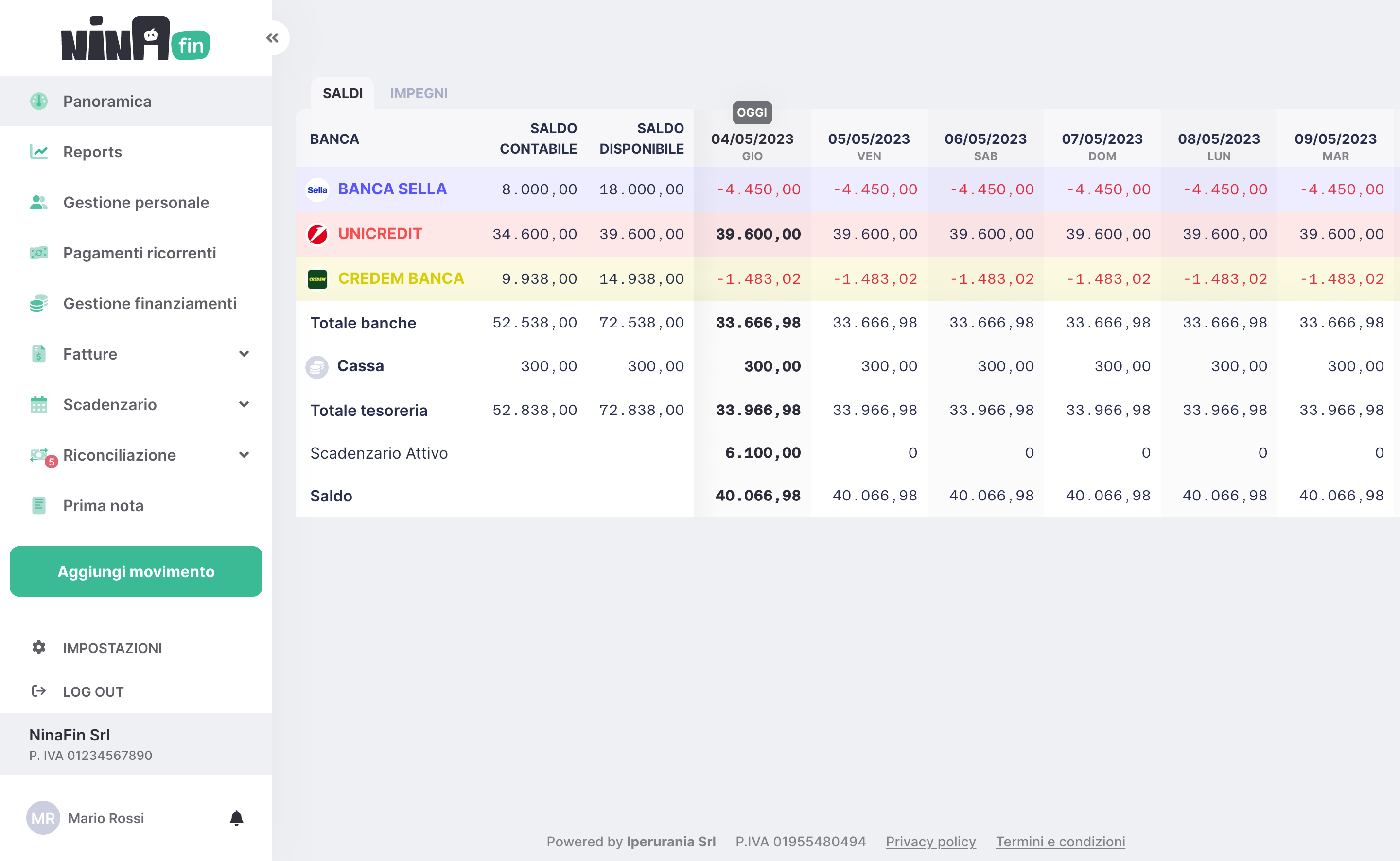 In corrispondenza di ogni conto corrente bancario e della cassa viene mostrato, giorno per giorno, il saldo disponibile al netto degli impegni attesi in funzione della loro scadenza.