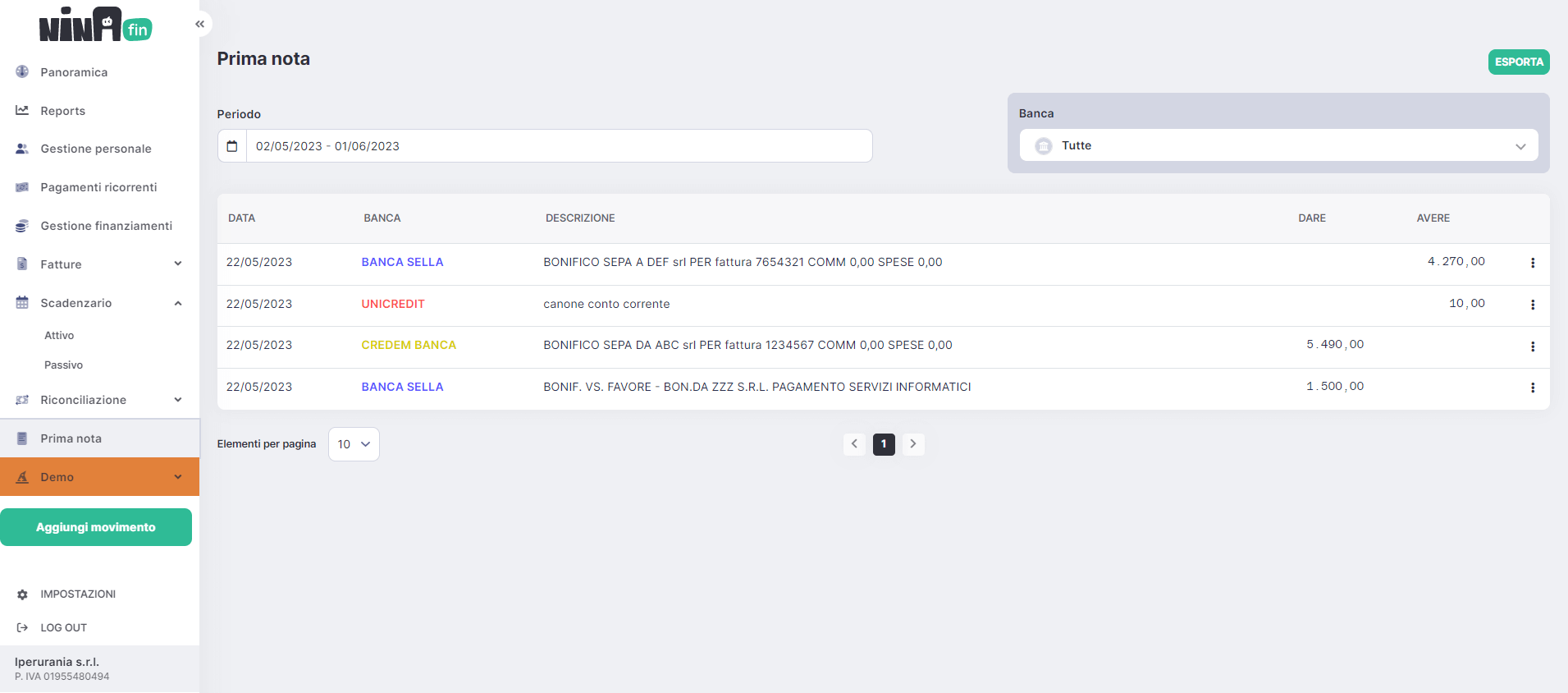 Tutte le transazioni sono registrate nella prima nota contabile. I movimenti delle banche sono resi disponibili per essere utilizzati in contabilità ed eventualmente letti direttamente dal commercialista.