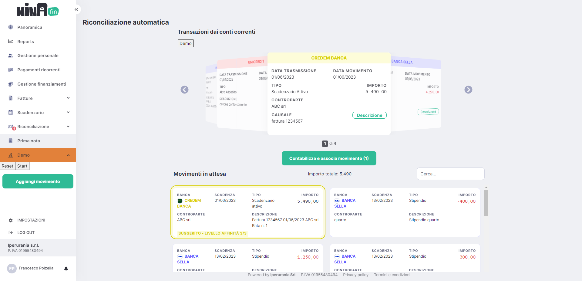 NinaFin riceve tutte le transazione dai conti correnti collegati e, attraverso NinaBrain® riconcilia automaticamente le transazioni con gli impegni (crediti e debiti) contenuti nello scadenzario.